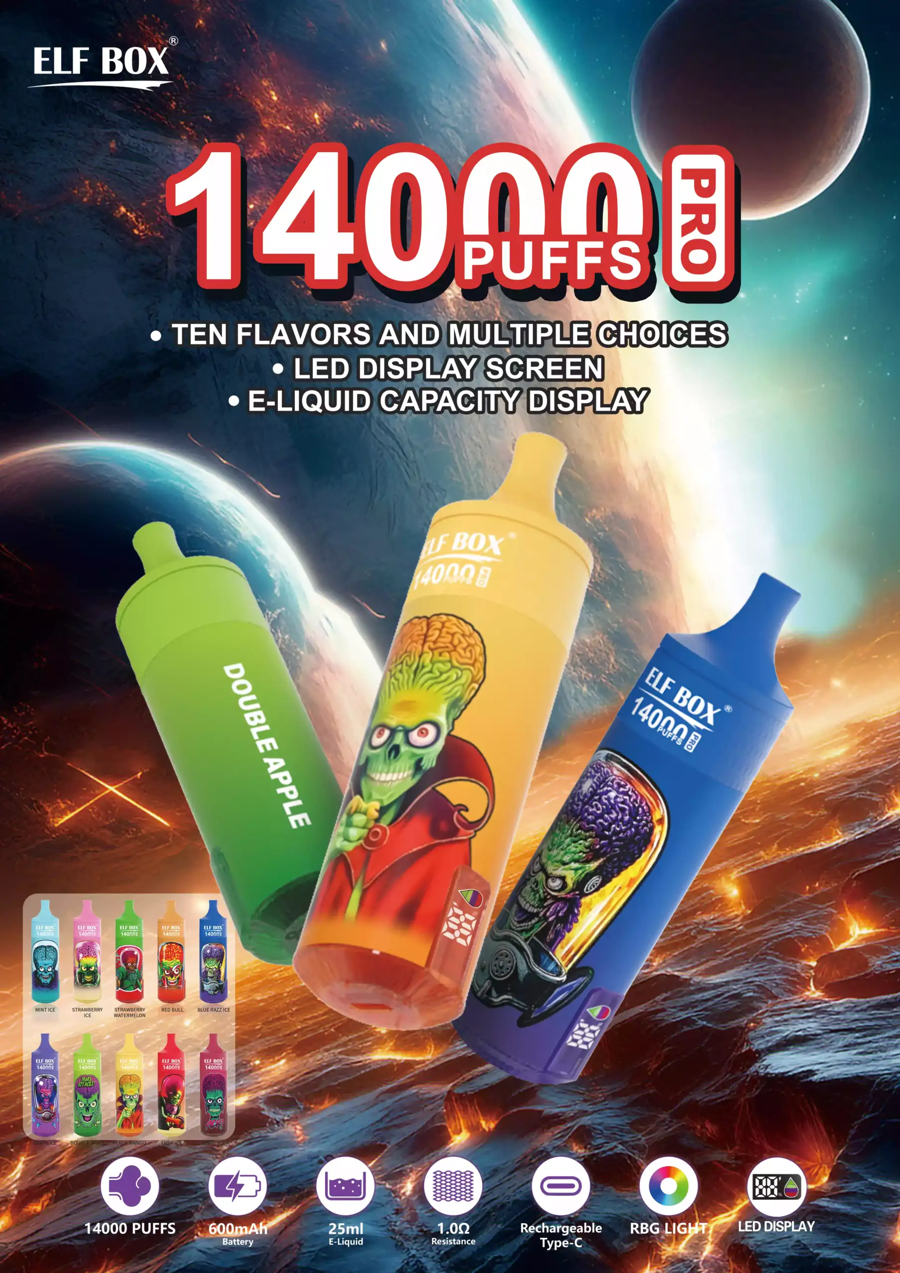 ELF BOX RGB 14000 cigarette électronique jetable avec 14 000 bouffées, 25 ml e-liquide, mesh coil 1.0Ω, batterie 600 mAh rechargeable Type-C, éclairage RGB et saveurs fruitées variées.